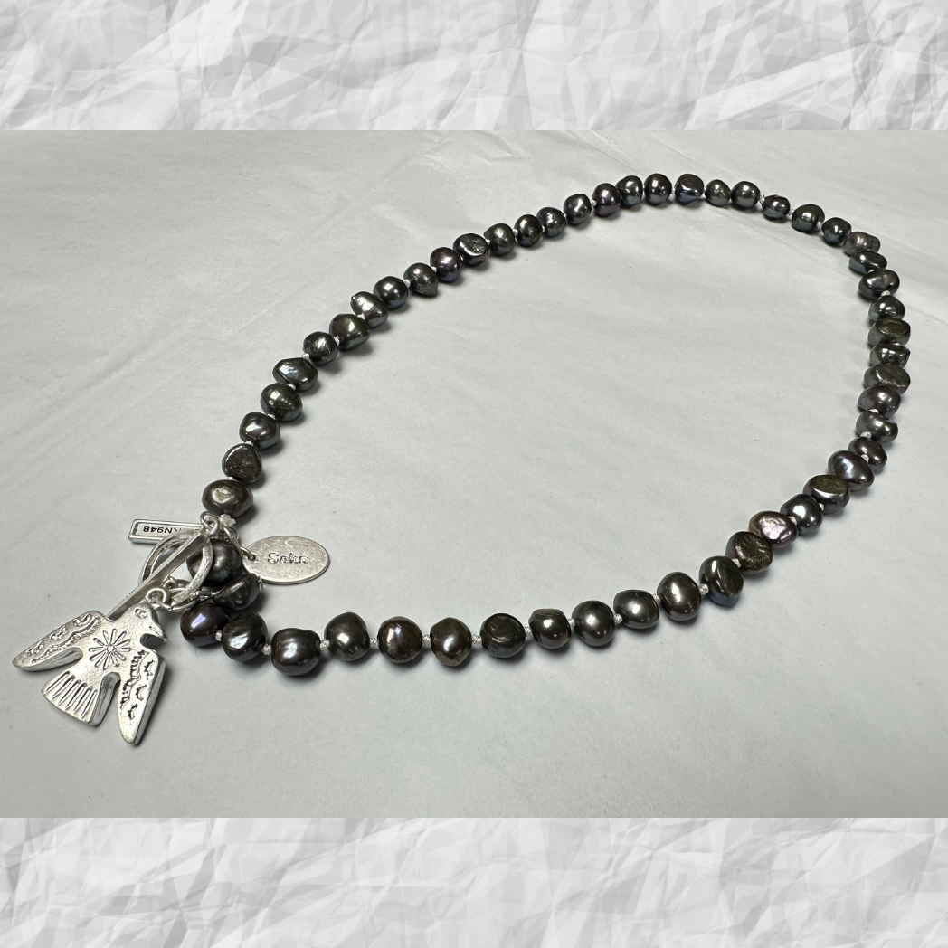 Dark Grey Pearl Necklace with Silver Angel Charm